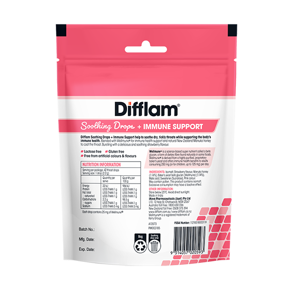 Difflam Soothing Throat Drops + Immune Support Strawberry soothe the throat and supports the body's immune health.